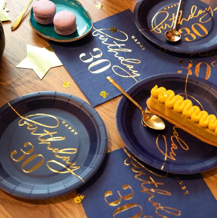 Złoty napis Happy Birthday 30 bardzo elegancko prezentuje się na granatowym matowym tle.
