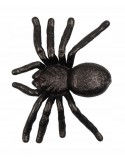 Czarny, duży pająk ma przerażające czerwone oczy i futrzane ciało, które wygląda bardzo realistycznie.