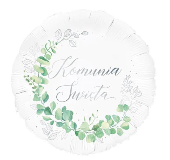 Na balonie znajduje się finezyjny, srebrny napis Komunia Święta otoczony wianuszkiem z zielonych i srebrnych liści eukaliptusa.