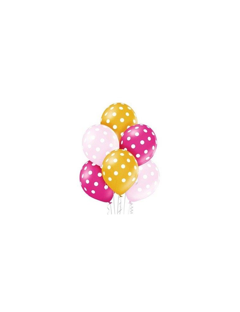 Zestaw sześciu kolorowych balonów lateksowych z nadrukiem kropek.