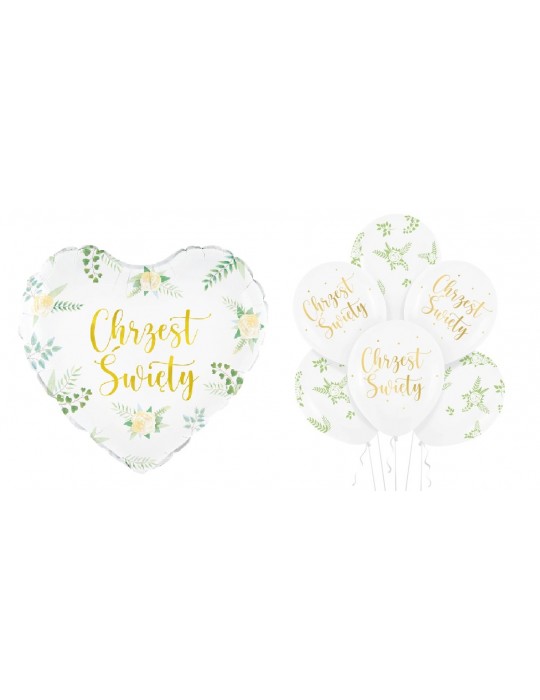 To zestaw białych balonów na chrzest składający się z trzech szt.uk ze złotym napisem Chrzest Święty oraz trzech balonów z zielonymi motywami gałązek i kwiatków piwonii, charakterystycznymi dla całej kolekcji. Balony są biodegradowalne.