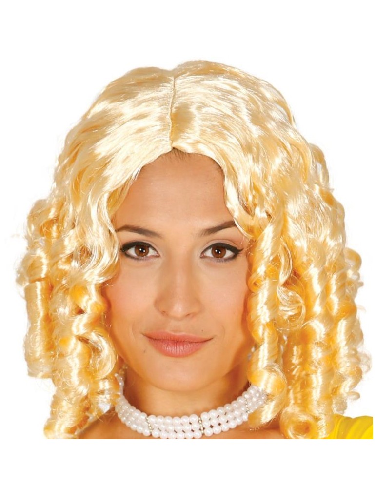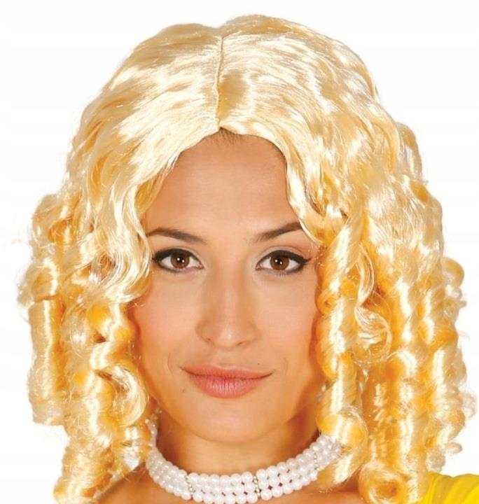 Damska peruka w kolorze ciemnego blondu, utrzymana w stylistyce barokowej.