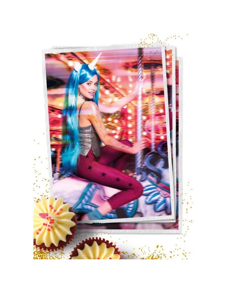 Peruka Długa Jednorożec Niebieska 85817 z białym rogiem i uszami Gwiezdny Pył Unicorn