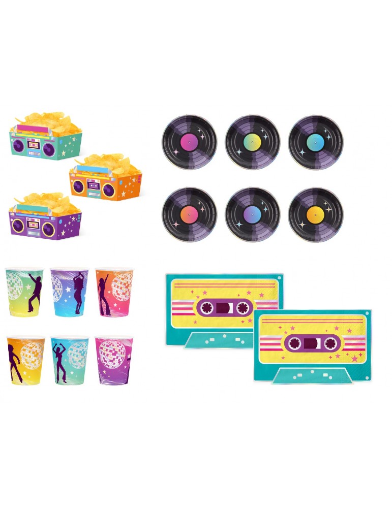 Zestaw Retro Disco Lata 70-te i 80-te Talerzyki Kubeczki Serwetki Pudełko na Chipsy 25el MK755