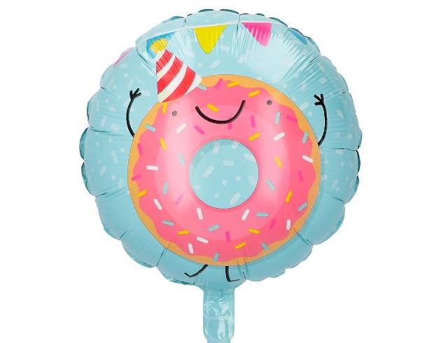 Ten wesoły jasnoniebieski balon foliowy z uroczym różowym wzorem pączka