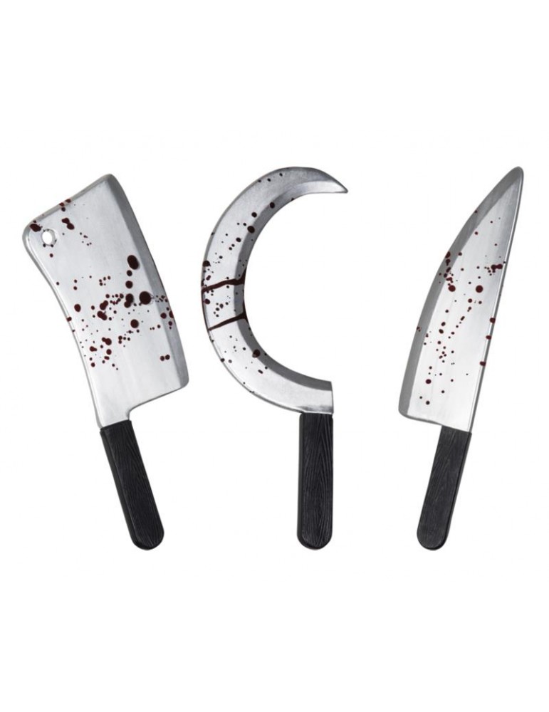 NOWOŚĆ! Trzy wzory zakrwawionych akcesoriów na Halloween. Do wyboru: duży nóż, tasak i sierp o długości 45 cm, wykonane z bezpiecznego materiału.
