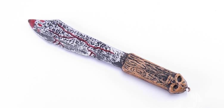 Plastikowy nóż poplamiony czerwoną farbką, która ma imitować krew.
