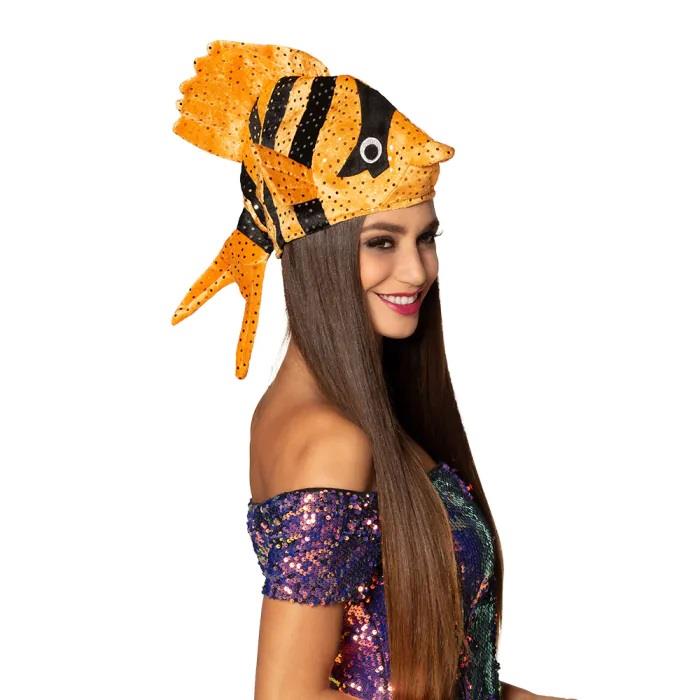 Czapka Ryba wykonana z miękkiego materiału, ozdobiona cekinami.