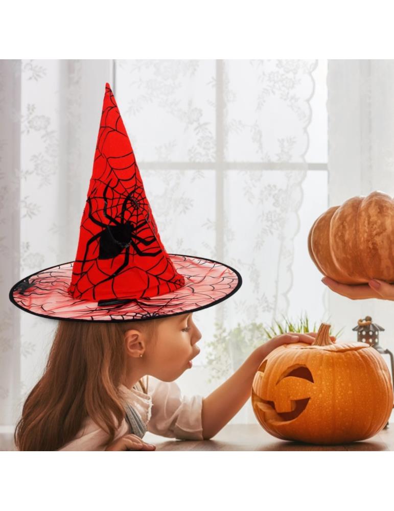 Kapelusz Czarownicy Czerwony CC245 z pajęczyną i Pająkiem Wiedźma Halloween Andrzejki
