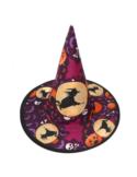 Kapelusz czarownicy wykonany jest z lekkiego przezroczystego materiału zesrebrnym nadrukiem halloweenowych elementów.