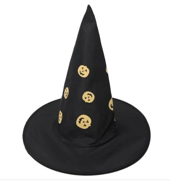 Kapelusz czarownicy wykonany jest z lekkiego czarnrgo materiału z nadrukiem uśmiechniętych dyń.