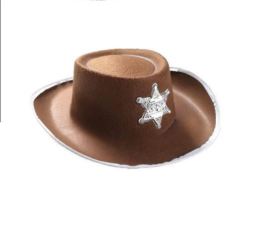 Kapelusz Szeryfa kolor brązowy z białą lamówką i gwiazdą srebrną szeryfa. Kapelusz wykonany ze sztywnego filcu.