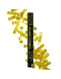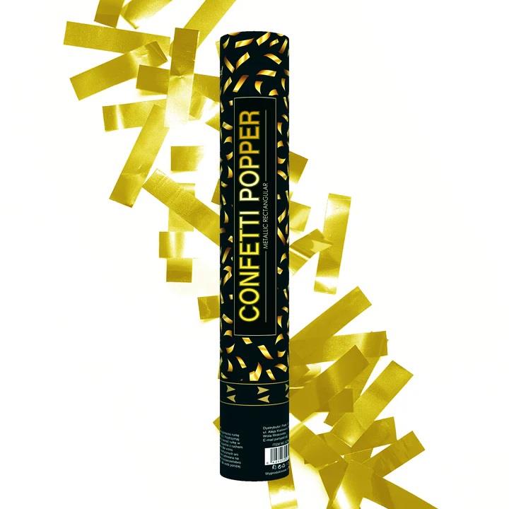 Tuba wystrzela złotym konfetti k kształcie pasków.