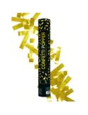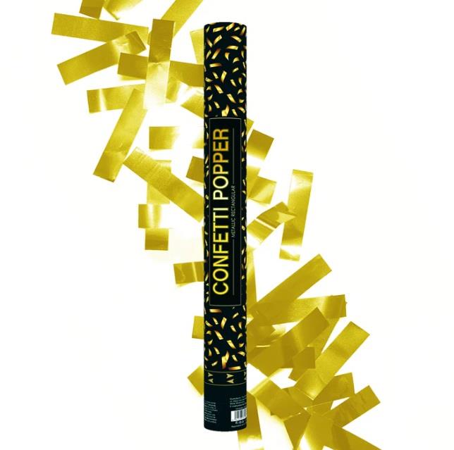 Tuba wystrzela złotym konfetti k kształcie pasków.