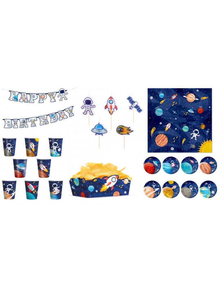 Fantastyczny zestaw kubeczków papierowych z różnymi kosmicznymi grafikami na każdym z nich. 8 planet Układu Słonecznego - na jaką planetę poleci młody uczestnik przyjęcia i przyszły kosmonauta?