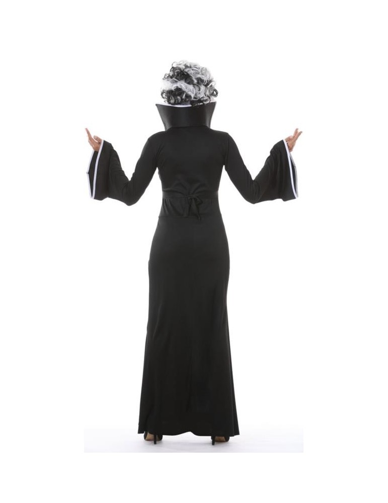 Długa czarna,bogato zdobiona suknia ze stojącym kołnierzem oraz długimi rozszerzanymi rękawami.