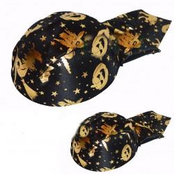 Czapka wykonana z usztywnionego filcu, pokryta czarnym materiałem ze złotym nadrukiem ( czarownica, dynia , kot )