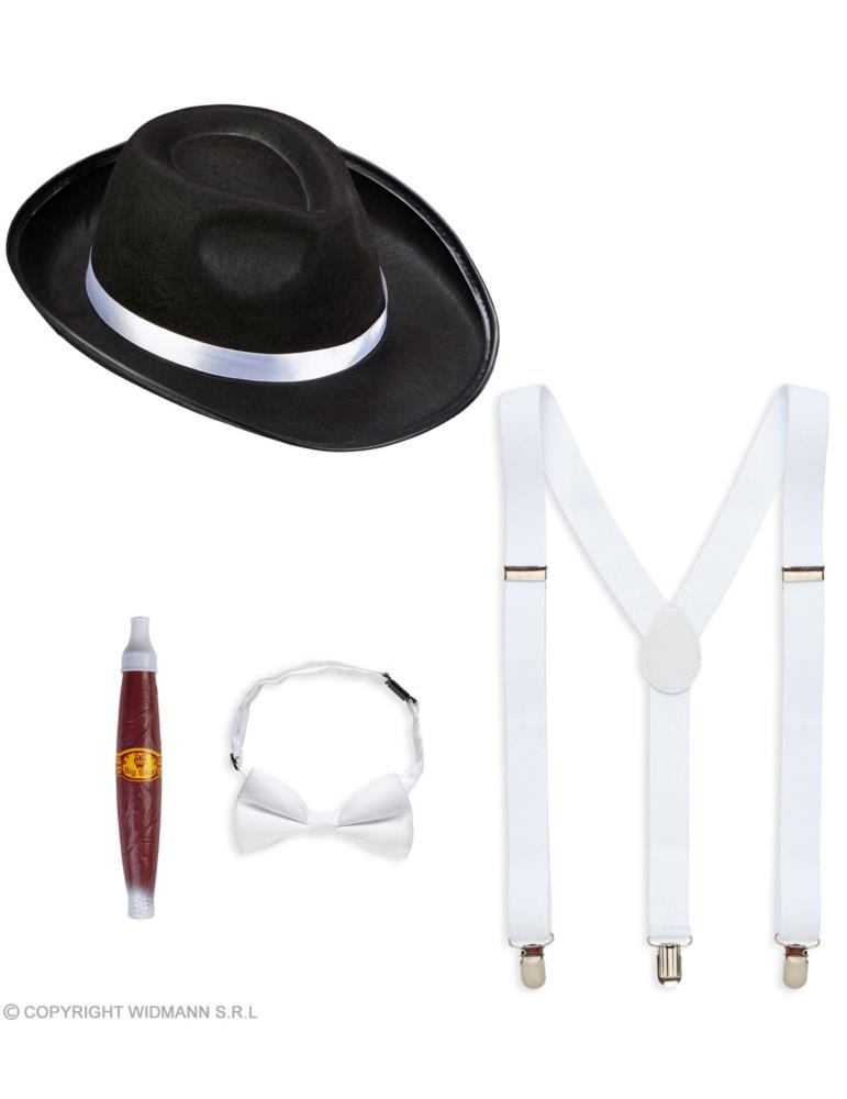 Zestaw Al Capone Gangstera 68555W Retro Prohibicja Lata 20-te kapelusz, szelki, cygaro, mucha