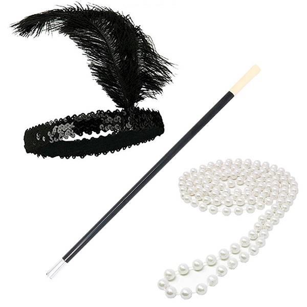 Elegancki zestaw inspirowany stylem lat XX to idealny wybór na tematyczne imprezy czy karnawał. Zawiera czarną opaskę ozdobioną piórkiem, dodającą klasycznej elegancji każdej stylizacji. Dopełnieniem jest długa fifka, podkreślająca styl retro, oraz naszyjnik z białych pereł, który dodaje szyku i blasku. Ten zestaw przeniesie Cię w klimat Wielkiego Gatsby’ego, pełen blichtru i dekadenckiej zabawy.