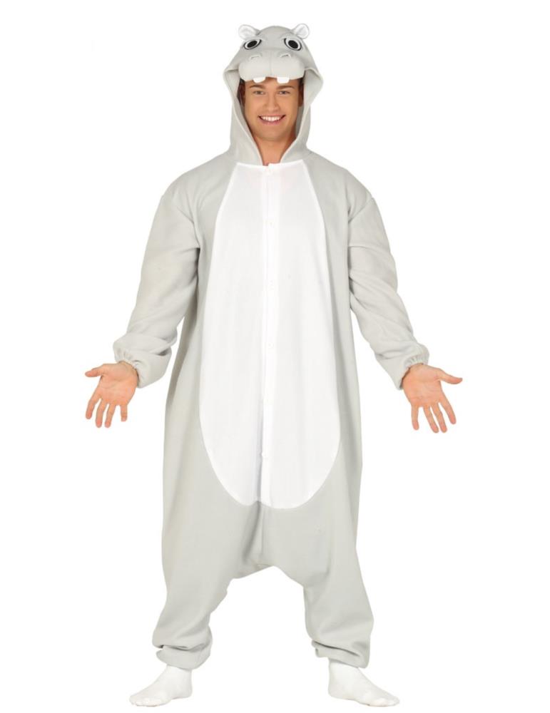 Przebranie zawiera jednoczęściowy kombinezon zapinany na guziki z kapturem imitującym głowę hipopotama.
