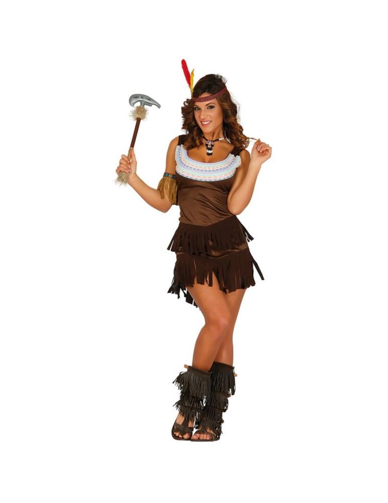 Strój indianki dla dorosłych.Krótka brązowa sukienka indianki z frędzlami. Góra przyozdobiona kolorowym nadrukiem na materiale.Opaska na głowę z dwoma piórkami.
