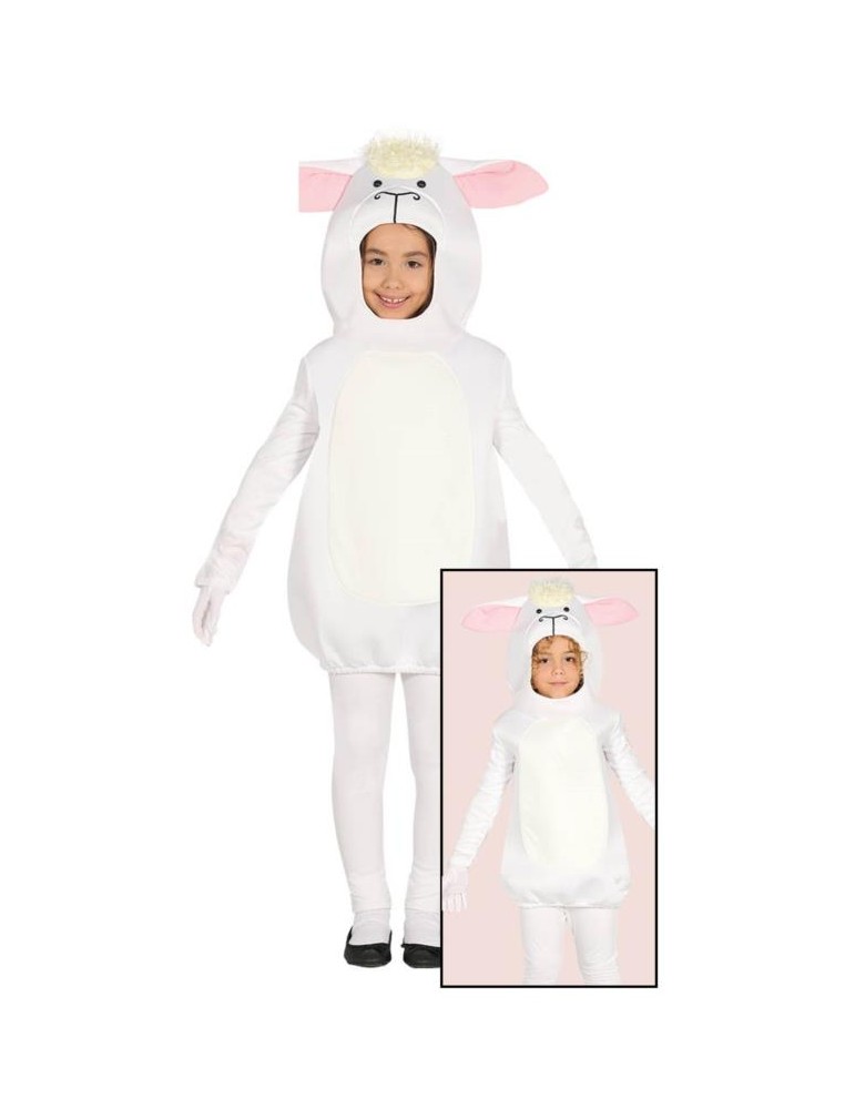 W skład stroju wchodzi : biała bluza z kapturem w formie głowy owieczki oraz białe spodnie.
