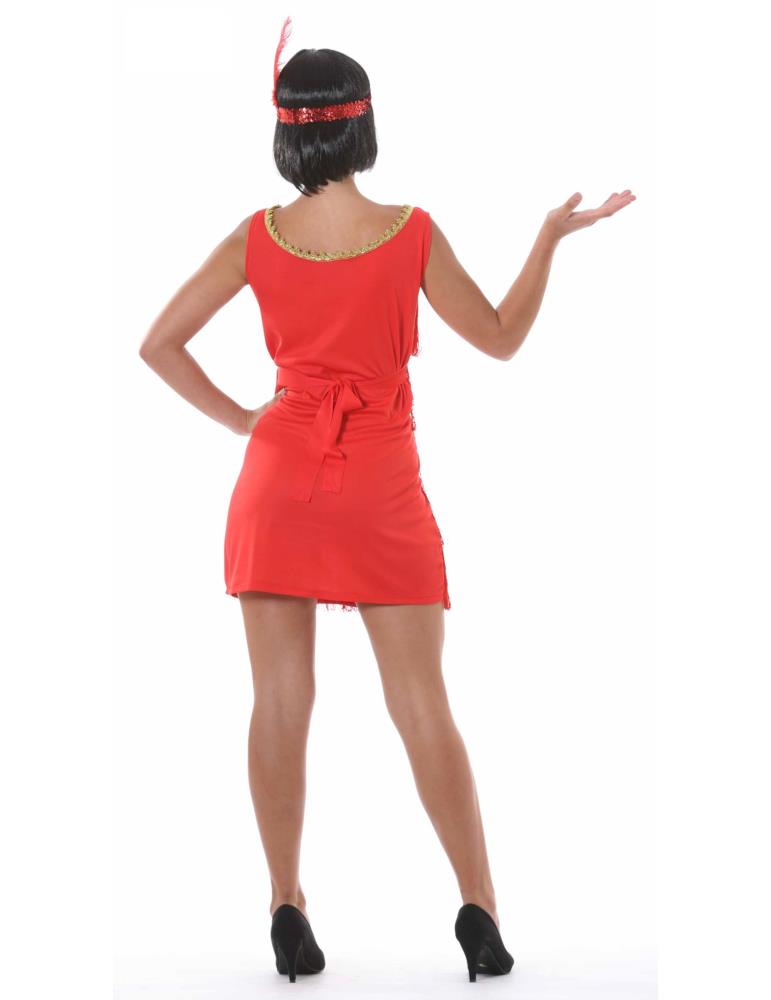 W skład stroju wchodzi czerwona sukienka z frędzlami oraz cekinowa opsaka z piórkiem na głowę.