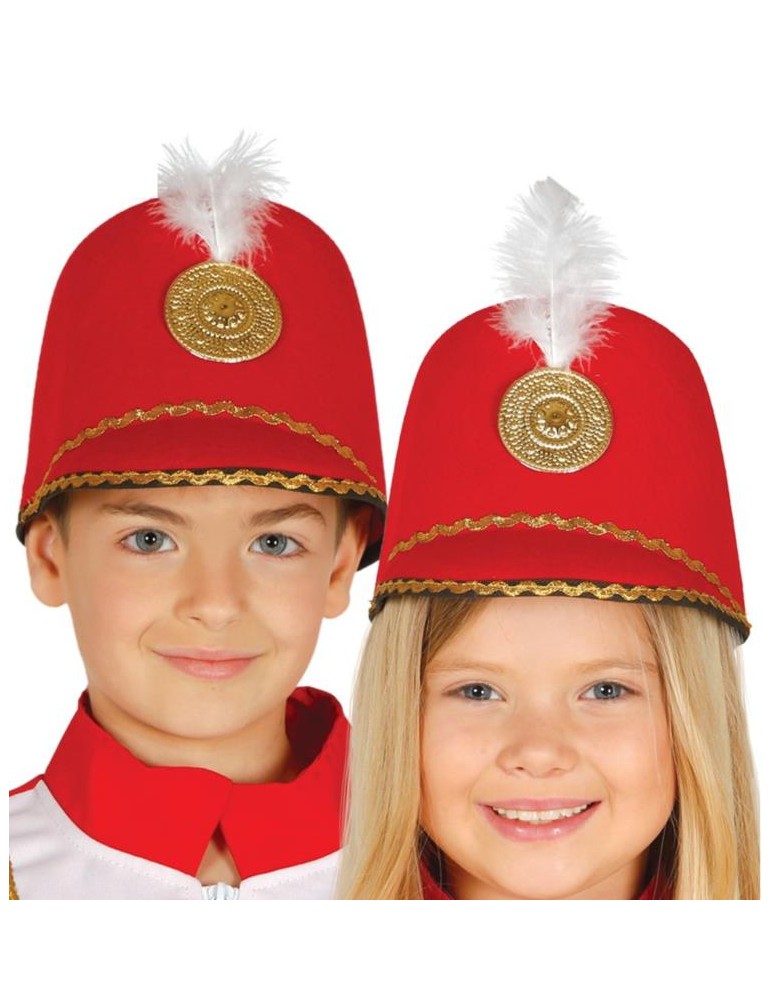 Czerwona czapka z daszkiem ze złotymi zdobieniami i białym piórkiem.