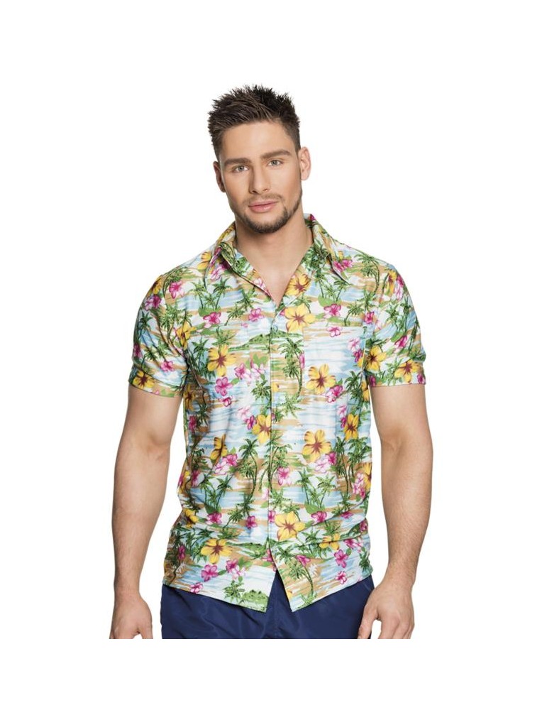 Na koszuli wzór w palmy i kolorowe kwiaty.