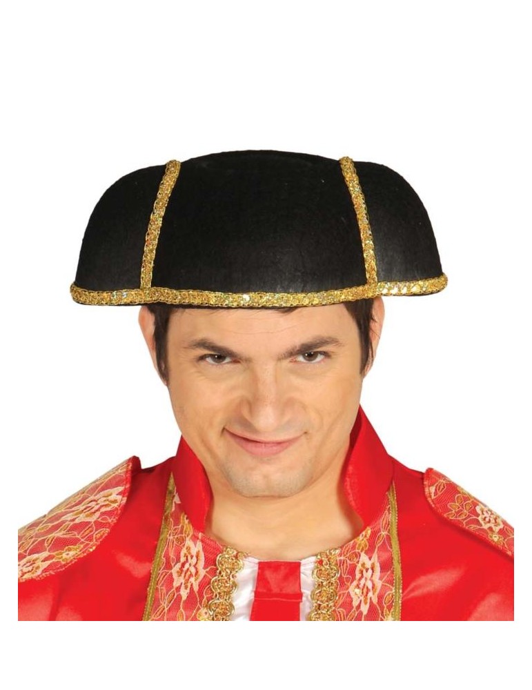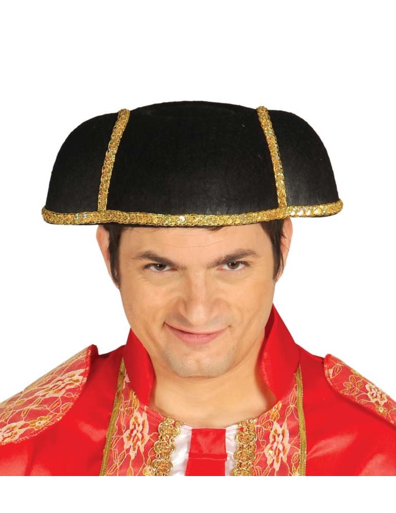 Czarna usztywniana czapka wykonana z filcu ze złotymi zdobieniami.