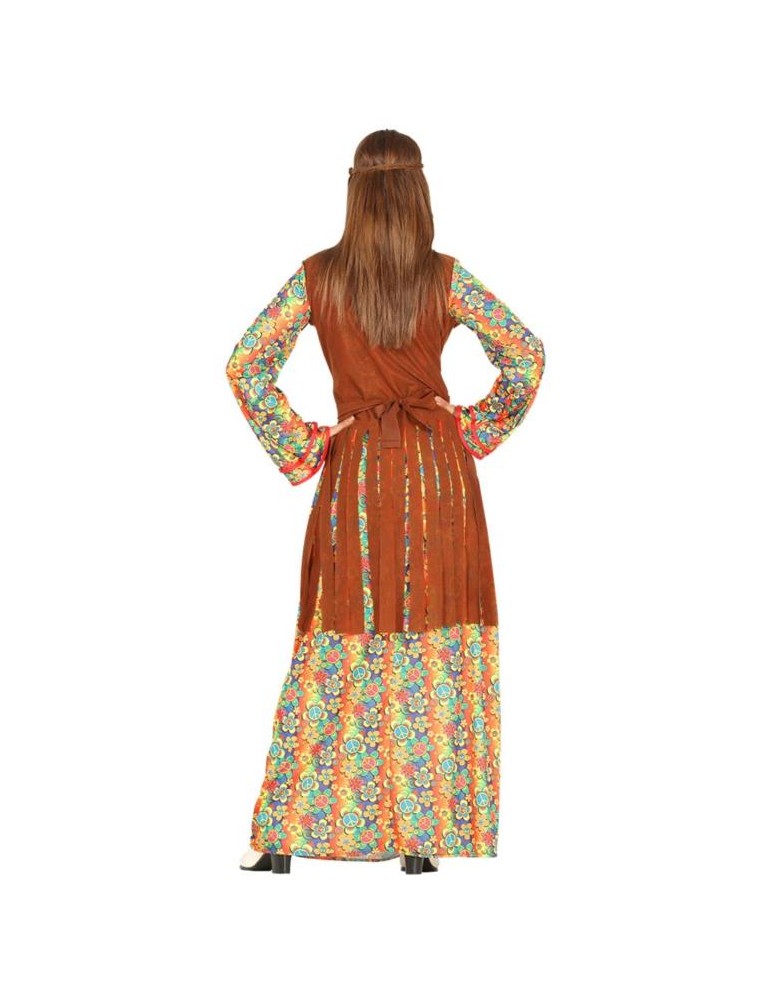Długa sukienka w kolorowe wzory z atrapą brązowej kamizelki.