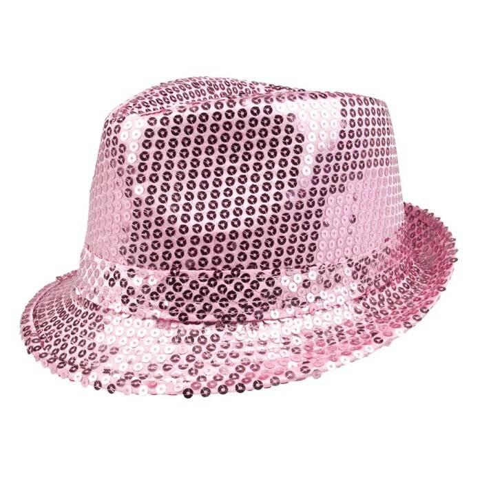 Kapelusz wykonany z materiału ozdobiony różowymi cekinami.