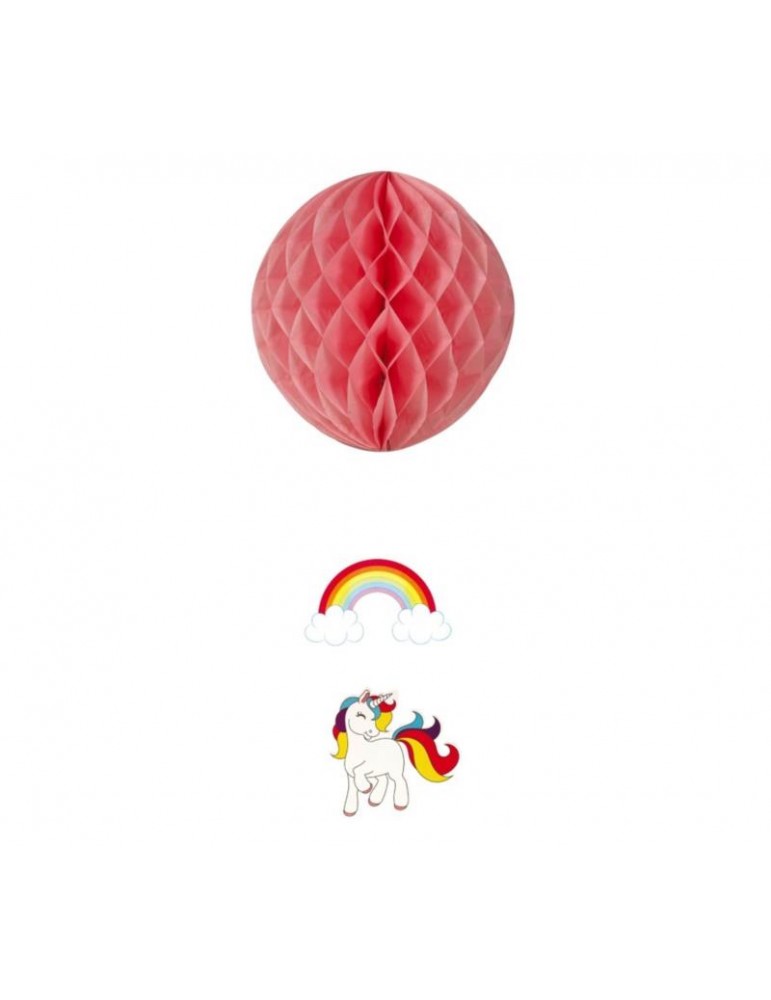 Różowa rozetka z zawieszoną dekoracją jednorożca.