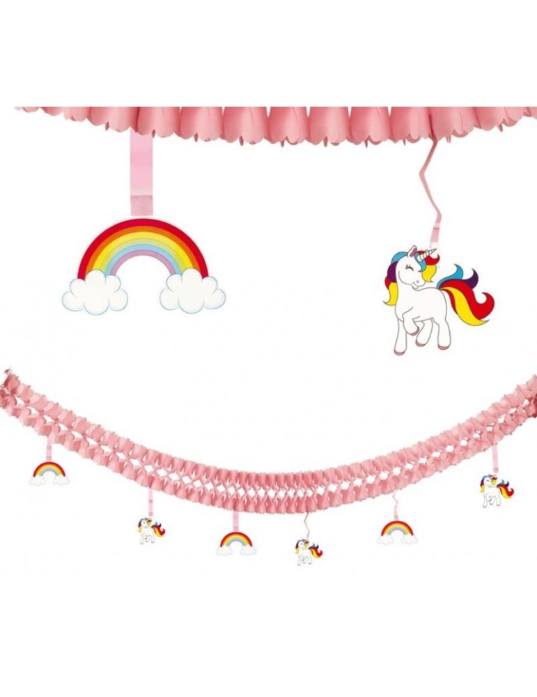 Dekoracja wykonana z bibuły z tekturowymi zawieszkami jednorożca oraz tęczy.
