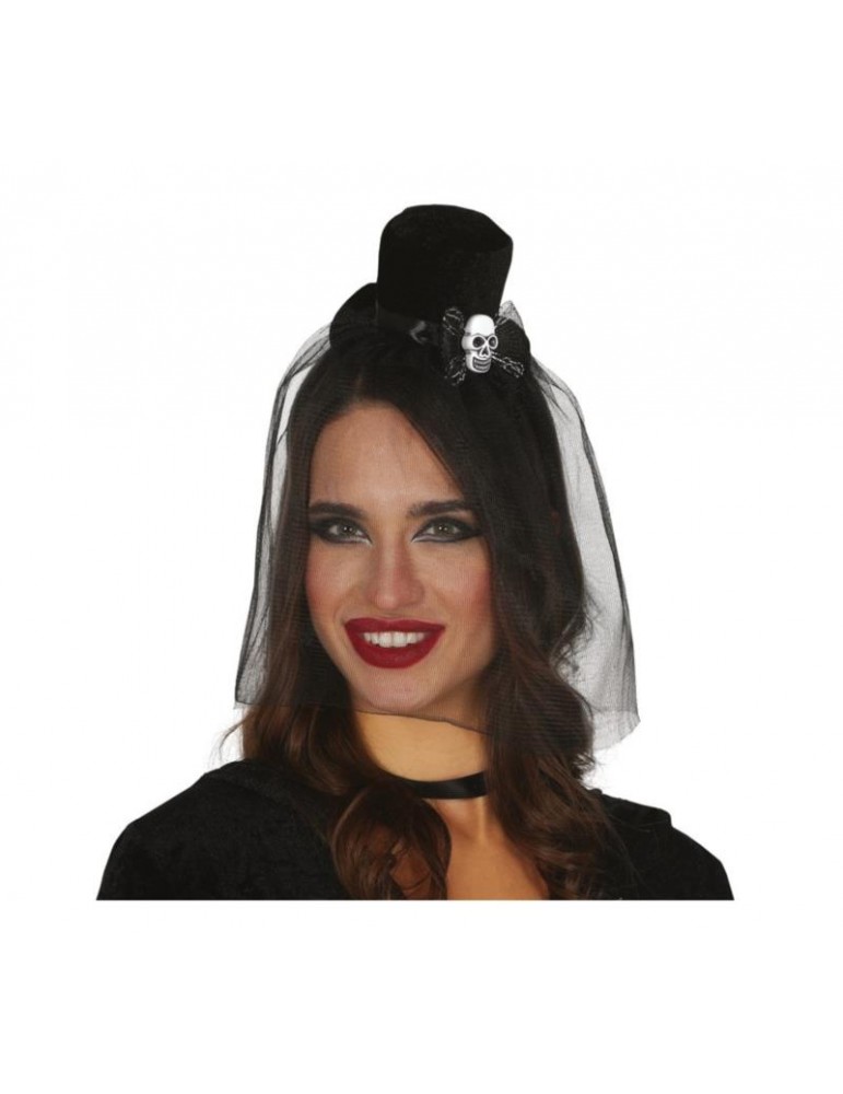 Opaska Mini cylinder z tiulem 26649BZ z czaszką Halloween
