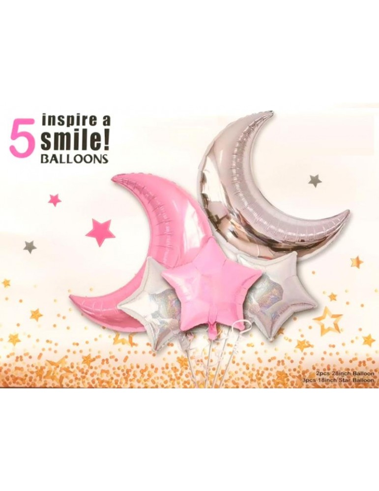 Zestaw Balonów Księżyce i Gwiazdki 5szt Różowy i Srebrny