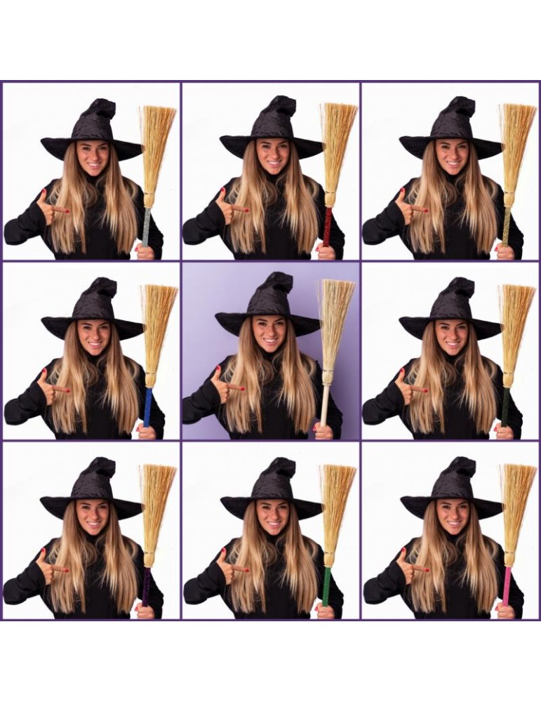Trzonek miotły pokryty jest błyszczącym kolorowym materiałem