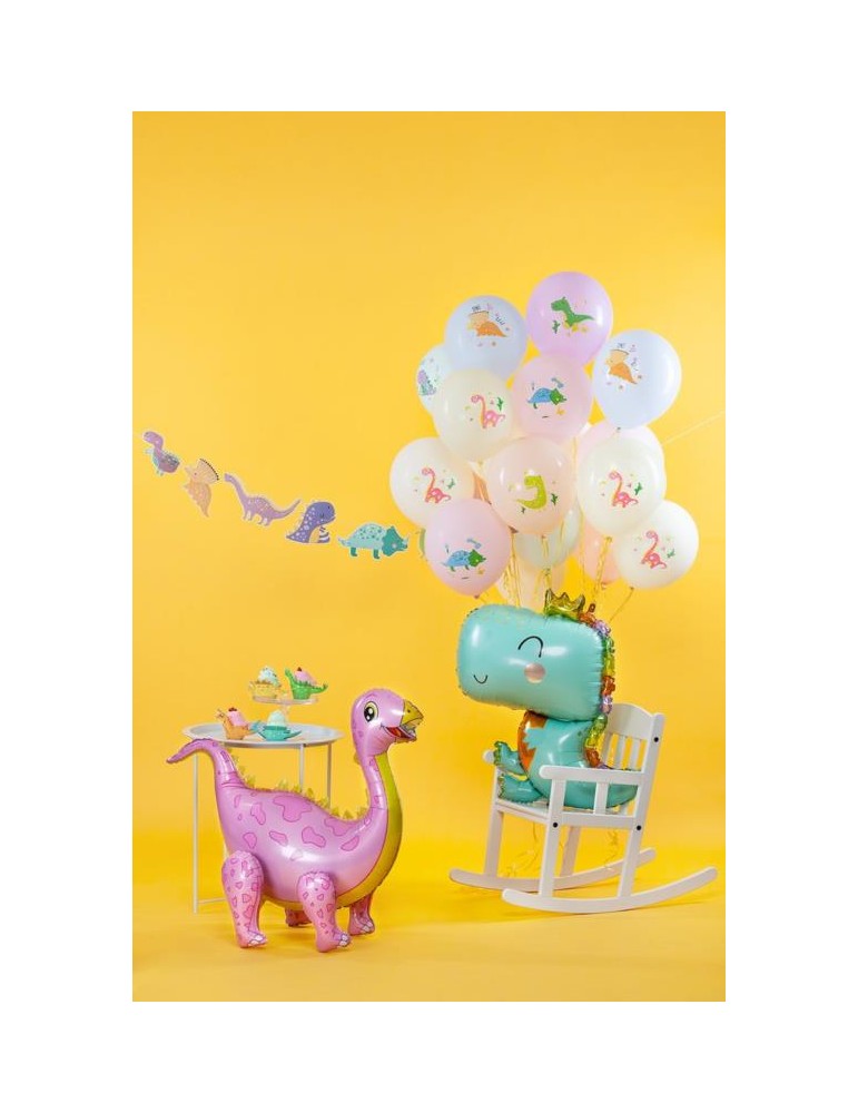 Zestaw kolorowych balonów z nadrukiem dinozaurów.