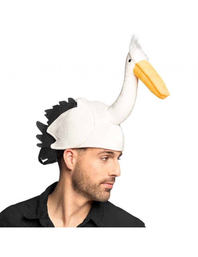 Biała czapka bociana z dziobem i skrzydłami, posiada z tyłu gumkę pozwalającą na regulację obwodu.