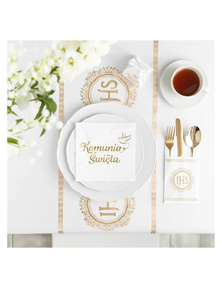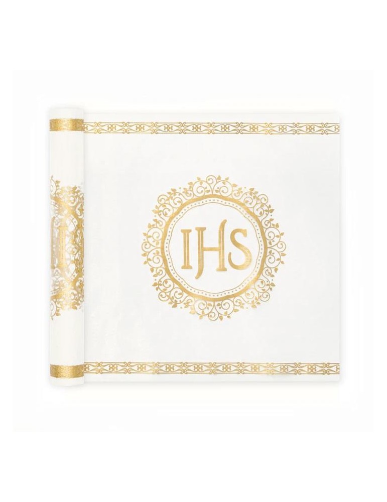 Biały bieżnik z organzy ze złotym napisem IHS
