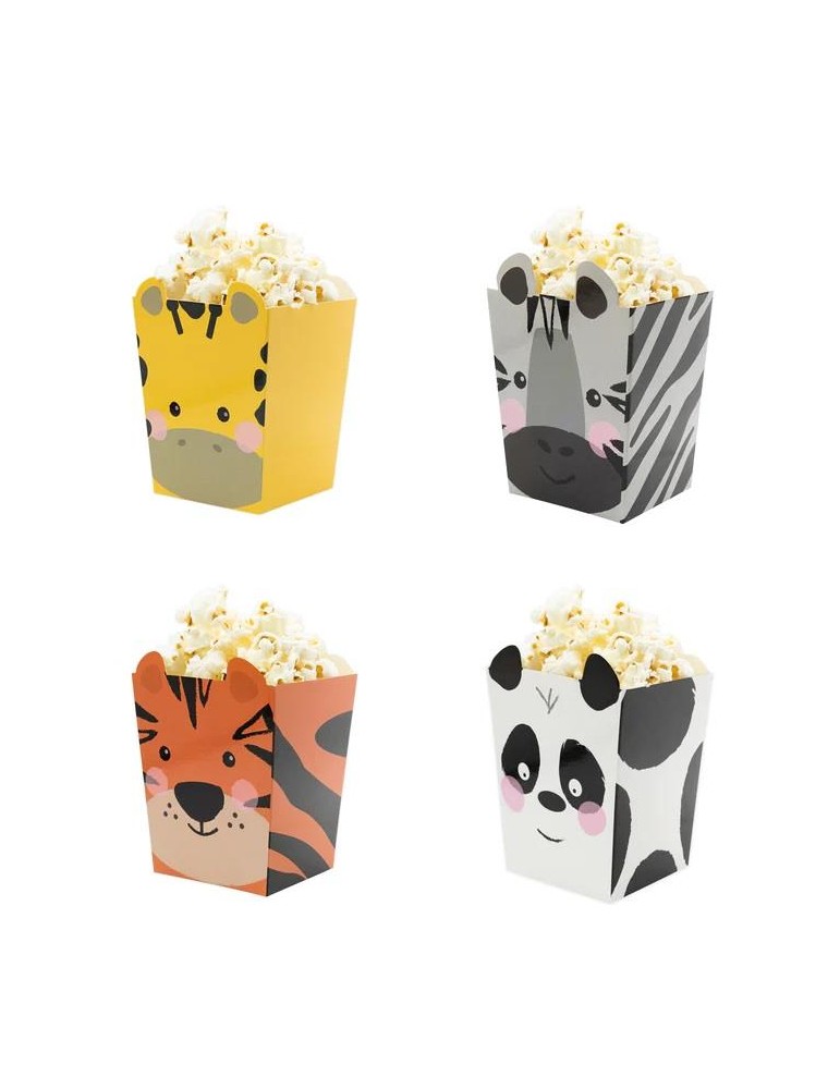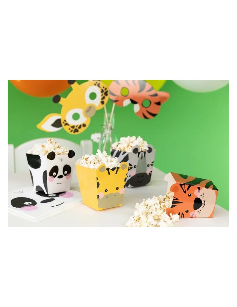 W zestawie 4 papierowych pudełek na popcorn .Każdy pojemnik przedstawia inne zwierzątko;zebra 1szt,żyrafa 1szt,panda 1szt,tygrys 1szt.