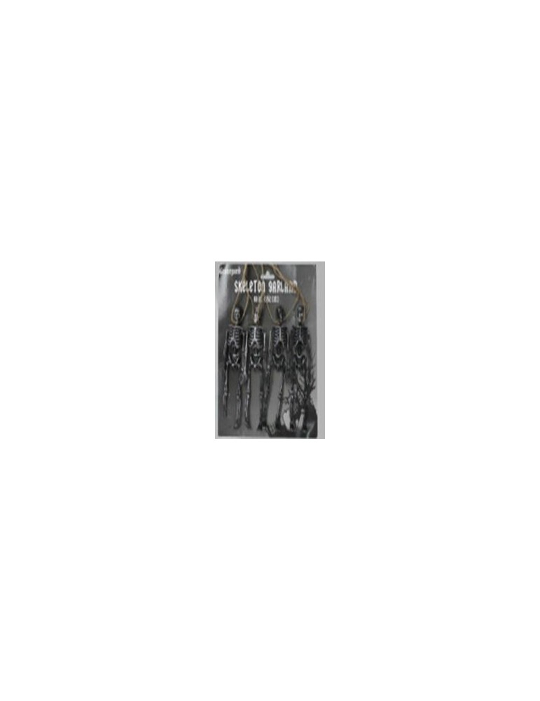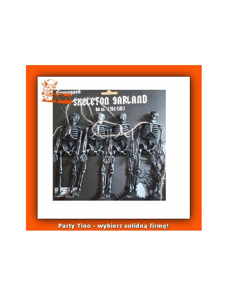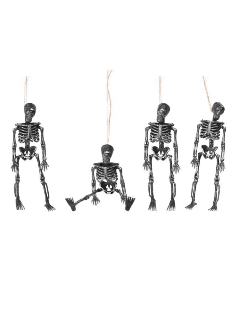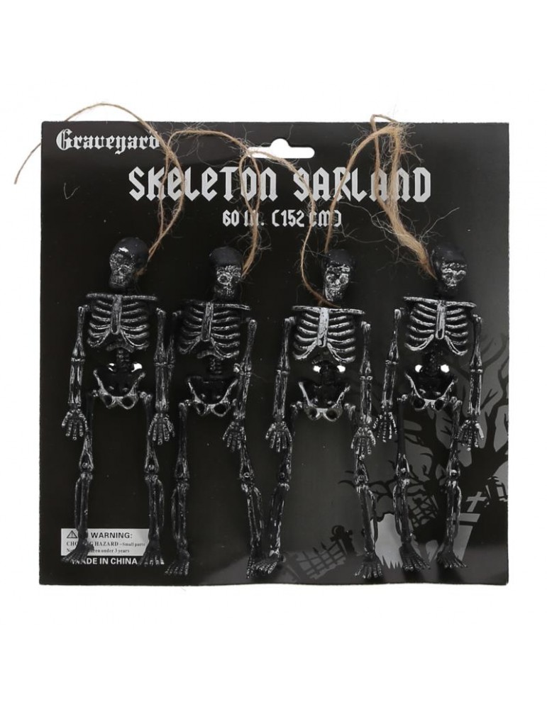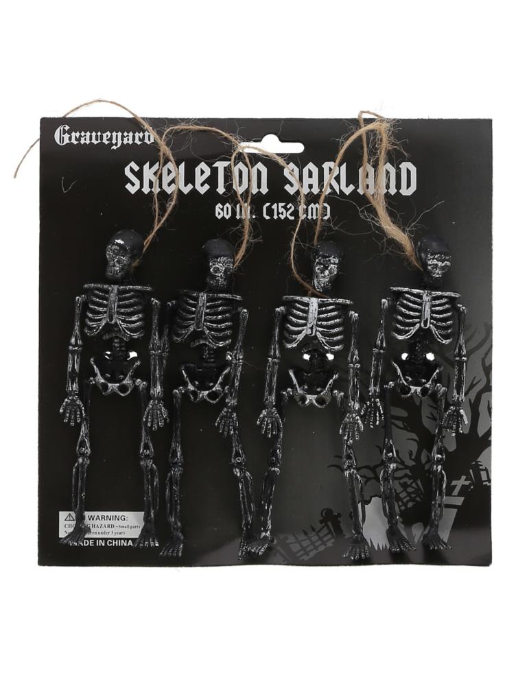Dekoracja zawiera 4 plastikowe szkielety połączone ze sobą jutowym sznurkiem, tworząc girlandę.