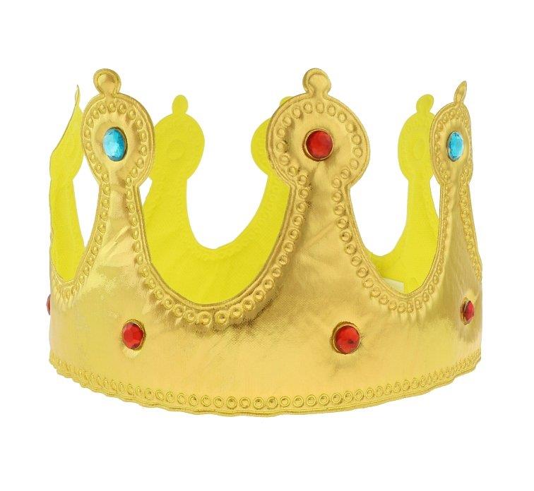 Złota korona wykonana z miękkiego,usztywnionego zlotego materiału zdobiona imitacją drogocennych kamieni.
