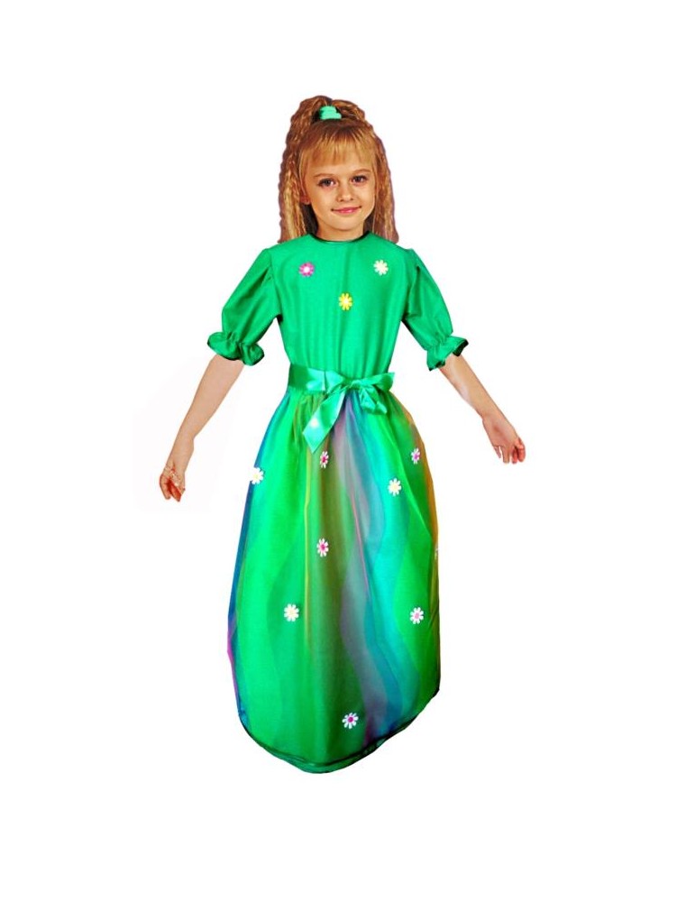 W skład stroju wchodzi: Przepiękna, zielona sukienka wykonana z poliestru i tiulu ozdobiona kolorowymi kwiatami.