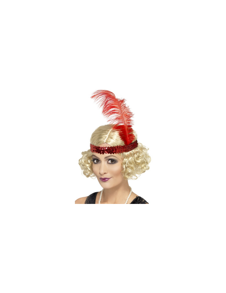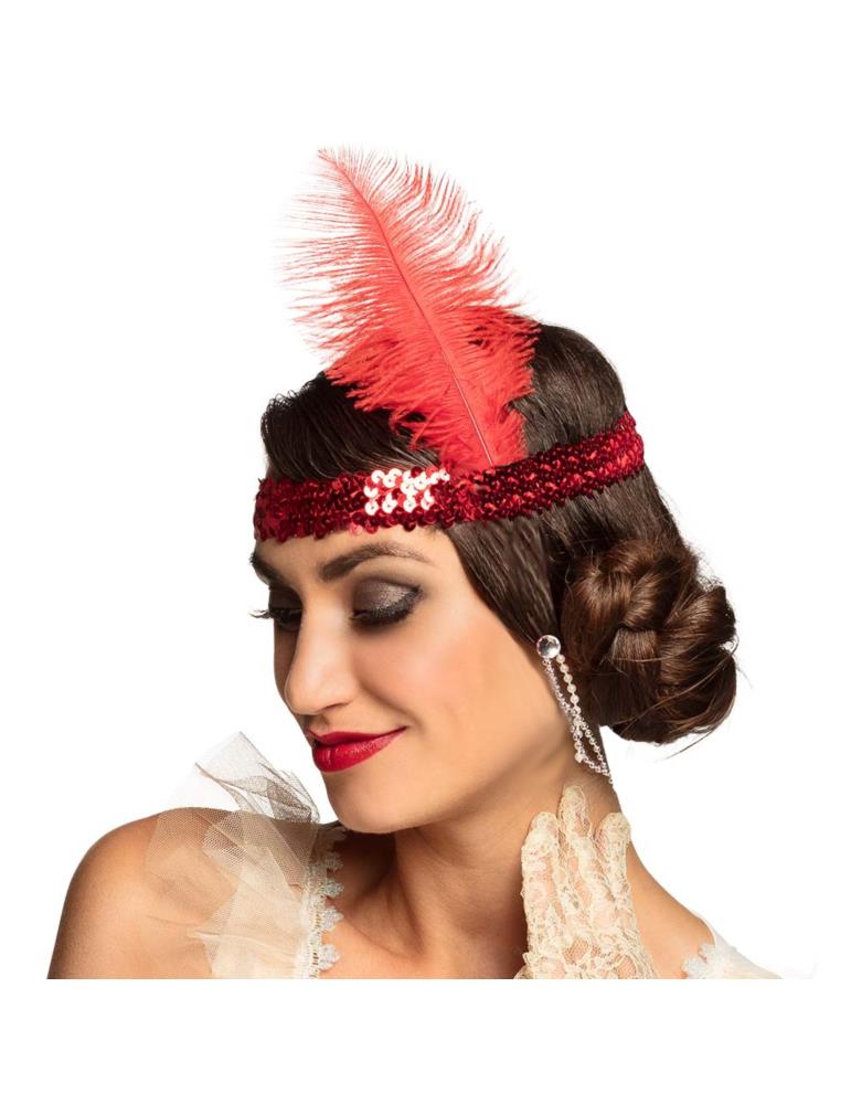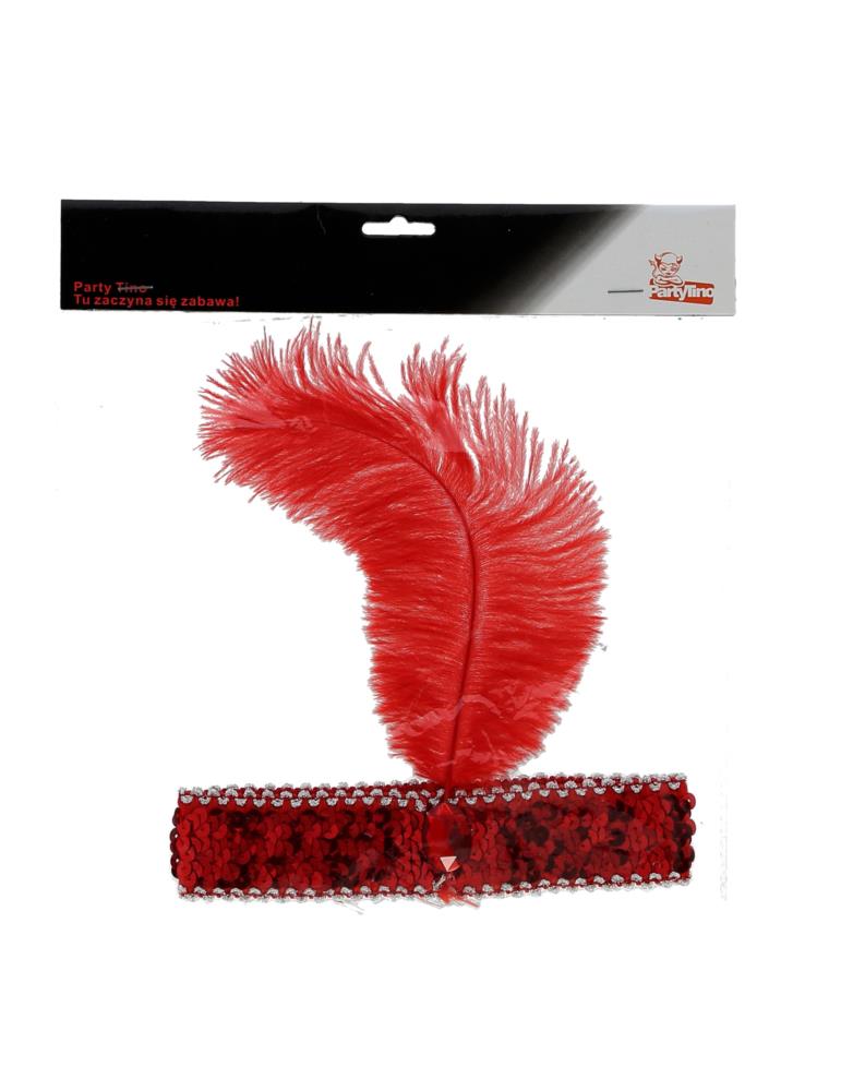 Elastyczna opaska Lata 20 z czerwonych cekinów z piórkiem.