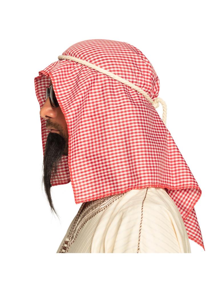 Strój przebranie Arabskiego Szejka nie może obyć się bez tradycyjnej arafatki wiązanej na głowie sznurem, charakterystycznej czarnej bródki i tajemniczych czarnych okularów