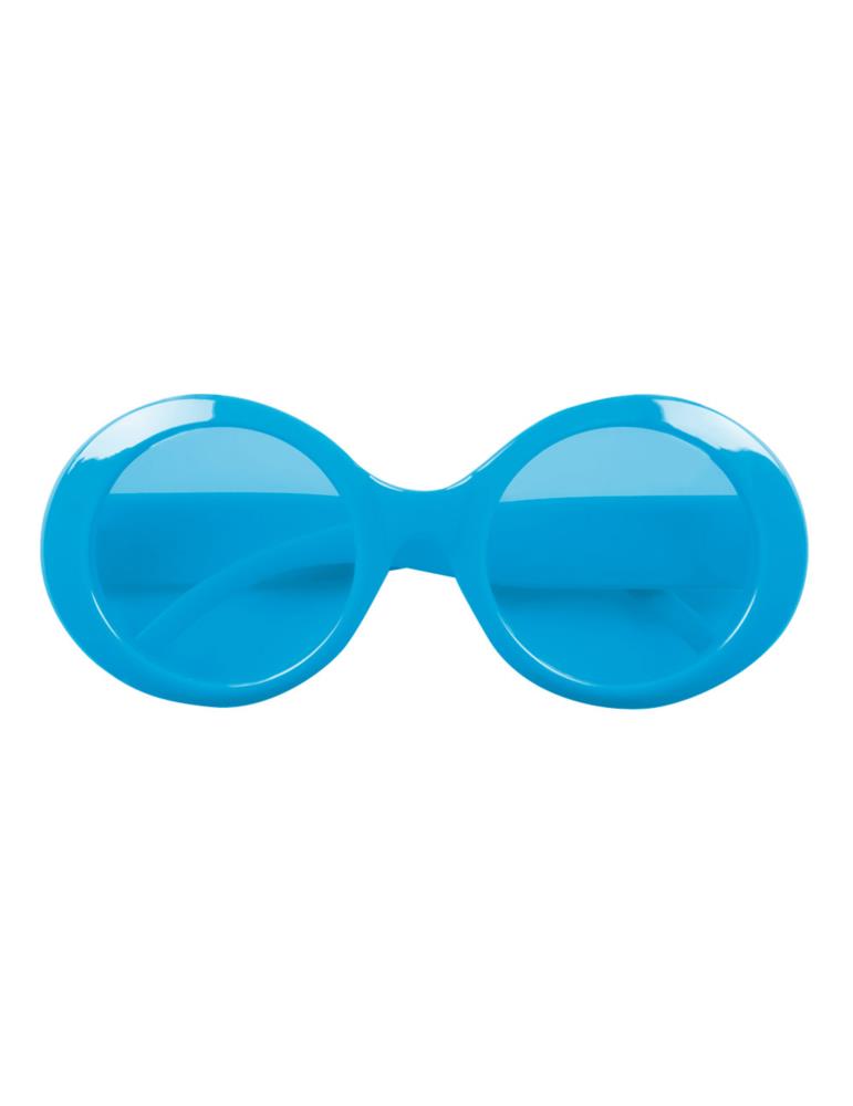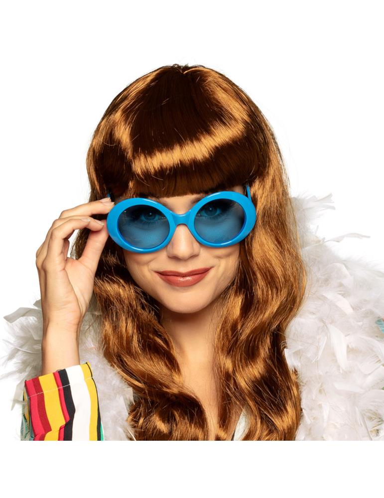 Okulary przeciwsłoneczne inspirowane latami 60. o okrągłym kształcie i grubych oprawkach w kolorze niebieskim oraz przyciemnianych na niebiesko szkłach.
