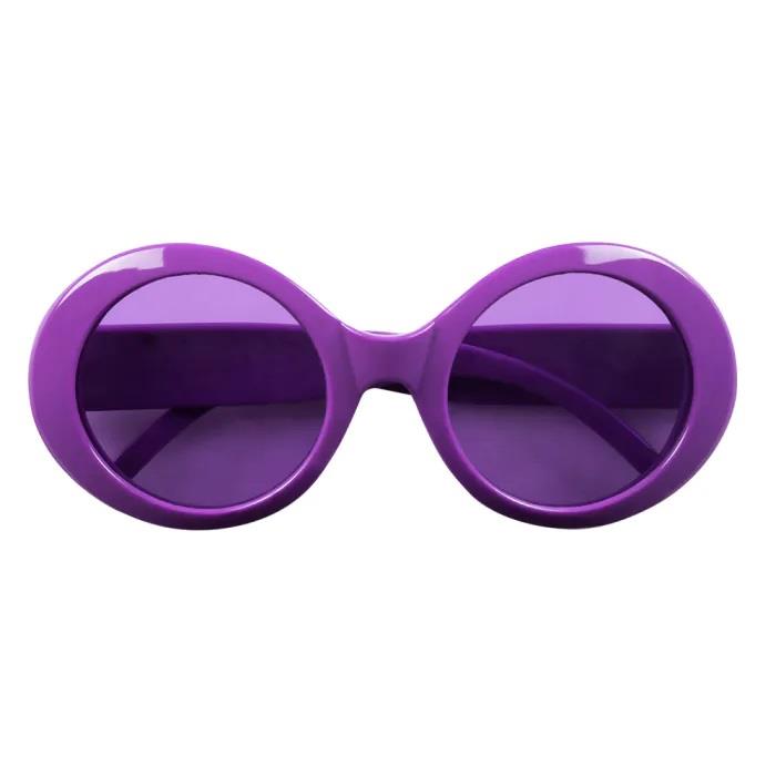 Okulary przeciwsłoneczne inspirowane latami 60 o okrągłym kształcie i grubych oprawkach w kolorze Fioletowym oraz przyciemnianych na fioletowo szkłach.