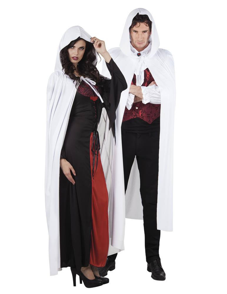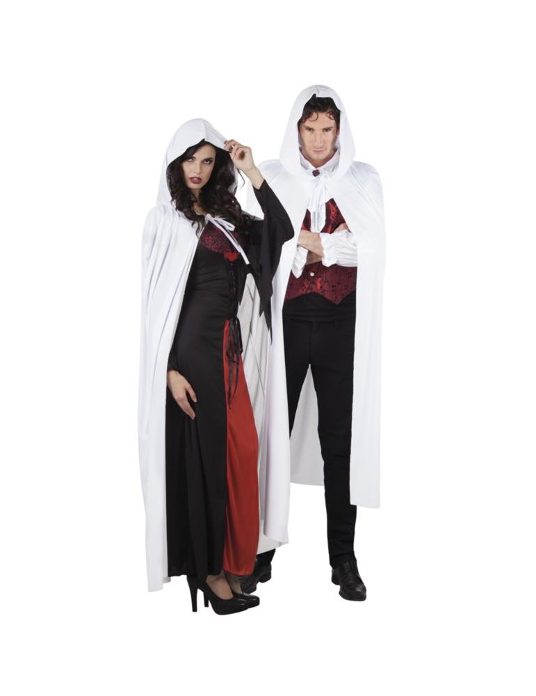 Długa biała wiązana pod szyją peleryna z kapturem.