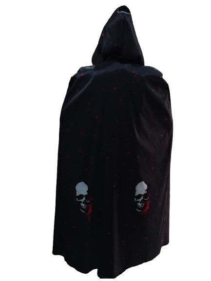 Czarną pelerynę z kapturem z motywem czaszek i krwi.